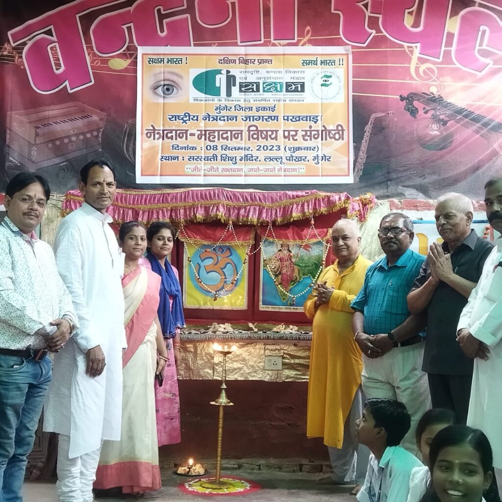 मुंगेर, (जिला ब्यूरो)। सरस्वती शिशु मंदिर लल्लू पोखर में शुक्रवार को नेत्रदान महादान विषय पर संगोष्ठी कार्यक्रम का आयोजन हुआ। कार्यक्रम का प्रारंभ दीप मंत्र के साथ विद्यालय के सचिव डॉ राकेश मोहन संरक्षक विनेश, प्रधानाचार्य जयंत कुमार चौधरी सक्षम संस्था के जिला अध्यक्ष भारत किशोर तथा सक्षम संस्था के प्रांतीय अध्यक्ष कांतमनी चौरसिया ने सामूहिक रूप से किया। कार्यक्रम को संबोधित करते हुए भरत किशोर ने कहा कि लोगों को नेत्रदान करना चाहिए। डॉ. राकेश मोहन ने कहा नेत्र दान कर किसी के जीवन को उजाला किया जा सकता है इससे बड़ा मानवीय पूजा और कोई दूसरा नहीं है दान का जीवन में बहुत महत्व है असहाय व्यक्ति को सहायता करना सबसे बड़ा पुण्य है। श्रीकांत मनु चौरसिया ने कहा कि प्रत्येक व्यक्ति कीआंख मरणोपरांत छह घंटे तक ठीक रहता है मरणोपरांत 6 घंटा तक नेत्रदान किया जा सकता है ।इस अवसर पर विद्यालय के आचार्य सुभाष, पंकज, संजीव कुमार, कुमार निलेश , मनीष कुमार, अनिल , संतोष कुमार आचार्य सुनीता, पूर्णिमा,निभा ,खुशी, शिप्रा साक्षी, रितु एवं पवन कुमार उपस्थित थे।