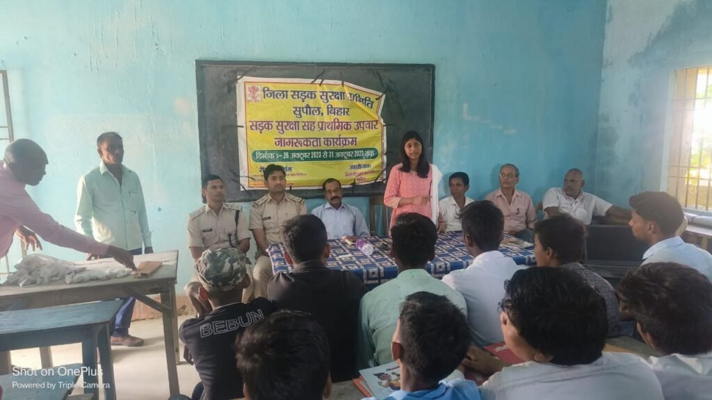 सुपौल, (जिला ब्यूरो)। आज दिनांक 30.10.2023 को जिला सड़क सुरक्षा समिति, सुपौल, बिहार के तत्वावधान में जिला सड़क सुरक्षा समिति सह प्राथमिक उपचार जागरूकता कार्यक्रम का आयोजन उच्च विद्यालयों में दिनांक 26.10.2023 से दिनांक 31.10.2023 तक जिला परिवहन कार्यालय, सुपौल द्वारा आपदा प्रबंधन एवं रेड क्रॉस सोसाइटी के साथ आयोजित किया जाना है।