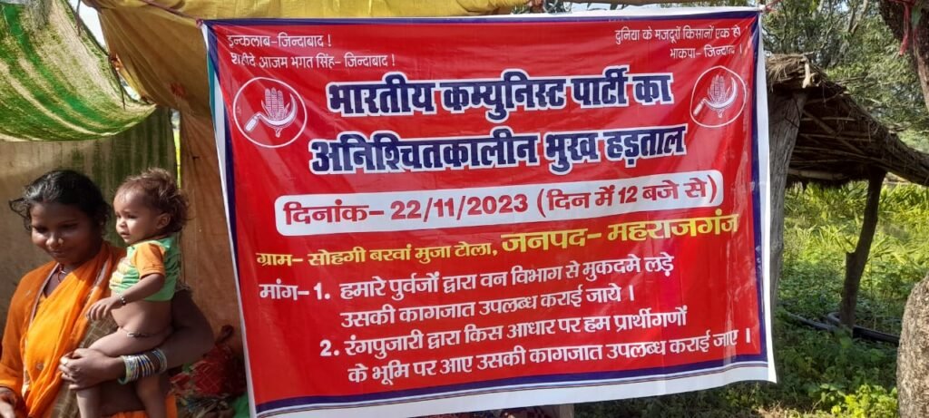 महराजगंज, (जनपद ब्यूरो)। तहसील निचलौल अंतर्गत ग्राम सभा सोहगी बरवा के मूजा टोला में अपने भूमि के बगल में भारतीय कम्युनिस्ट पार्टी के बैनर तले अनिश्चितकालीन भूख हड़ताल पर बैठे ग्रामीण। जो दिनांक 22-11-2023 से ही धरना-प्रदर्शन कर भूख हड़ताल पर बैठे हैं।