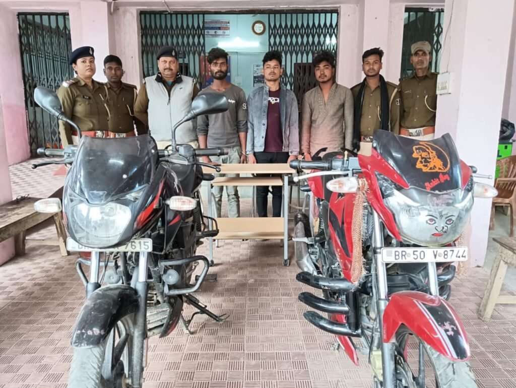 त्रिवेणीगंज, (सुपौल)। थाना क्षेत्र के कुशहा गांव स्थित पुल के समीप रविवार की संध्या घर से लौट रहे एक व्यक्ति से चार अपराधियों ने पल्सर बाइक छीन लिया। इस दौरान ग्रामीणों ने एक अपराधी को दबोच लिया। सूचना पर त्रिवेणीगंज पुलिस ने वारदात में शामिल दो अपराधियों को भी गिरफ्तार किया है। उनके पास से लूट गई पल्सर बाइक और लूट में प्रयुक्त एक अपाचे बाइक बरामद की गई है।