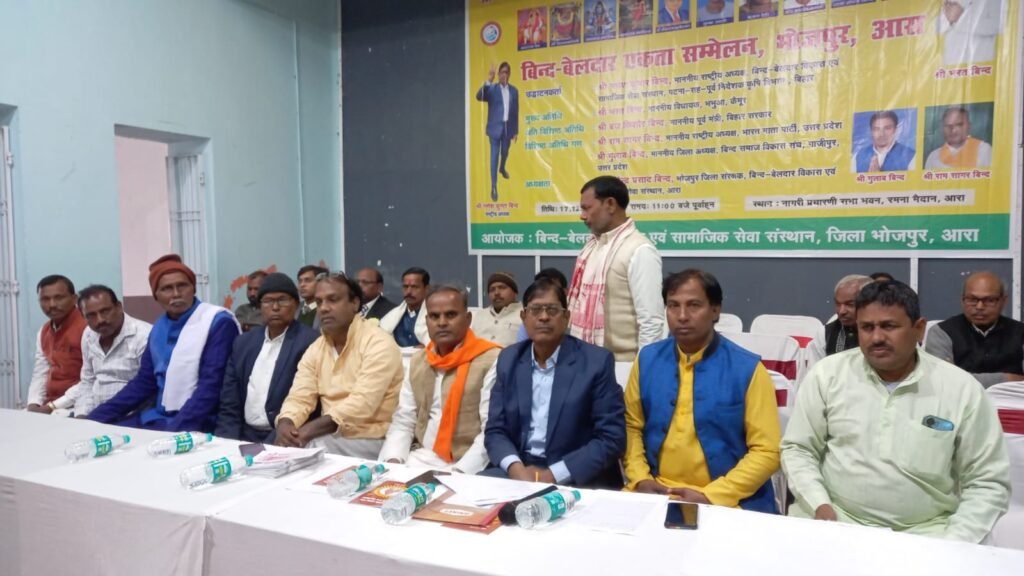 भोजपुर । नागरी प्रचारिणी सभा भवन, रमना मैदान, में बिन्द बेलदार एकता सम्मेलन का आयोजन किया गया।जिसका उद्घाटन गणेश कुमार बिन्द, राष्ट्रीय अध्यक्ष बिन्द-बेलदार विकास एवं सामाजिक सेवा संस्थान, पटना भरत बिन्द, विधायक, भभुआ कैमूर, ब्रज किशोर विन्द पूर्व मंत्री बिहार सरकार तथा राम सागर बिन्द, राष्ट्रीय अध्यक्ष, भारत माता पार्टी, उत्तर प्रदेश द्वारा संयुक्त रूप से किया गया। संस्थान के राष्ट्रीय अध्यक्ष गणेश कुमार बिन्द ने अपने सम्बोधन में कहा कि बिहार में बिन्द जाति की जनसंख्या-55-13 लाख एवं बेलदार जाति की जनसंख्या-20.45 लाख तथा भोजपुर जिला में बिन्द जाति की आवादी 3.63 लाख है परन्तु बिहार सरकार द्वारा बिन्द जाति की आवादी काफी कम अर्थात 12.85 लाख तथा बेलदार जाति की आवादी -4.53 लाख दिखाया गया है। बिन्द एवं बेलदार जाति की आवादी 75 लाख से अधिक होने के बाद भी इनकी अपनी कोई पहचान नहीं है और ये सभी जातियों से अधिक पिछड़ी हुई हैं। इसलिए इन्हें अनुसूचित जाति की सूची में शामिल करने तथा जातीय गणना में हुई गड़बड़ी में सुधार करने की मांग सरकार से की। भरत बिन्द विधायक भभुआ ने शिक्षा के महत्व को बताते हुए कहा कि बिन्द जाति लोगों को अपने बच्चों की पढ़ाई पर विशेष ध्यान देना चाहिए। ब्रज किशोर बिन्द, पूर्व मंत्री बिहार सरकार ने बिन्द जाति के लोगों को एकजुट रहने का आह्वान किया। राम सागर बिन्द, राष्ट्रीय अध्यक्ष भारत माता पार्टी उत्तर प्रदेश ने कहा कि भगवान महादेव बिन्दों के आदि कुल देवता तथा मां बिन्ध्यवासिनी आदि कुल देवी है, इसलिए गर्व से कहो कि हम बिन्द जाति से आते हैं। बिन्द जाति के लोगों की अपनी पहचान एवं सत्ता पर अधिकार हेतु अपने नाम के अंत में अपना टाइटिल सिर्फ और केवल सिर्फ बिन्द लिखे।