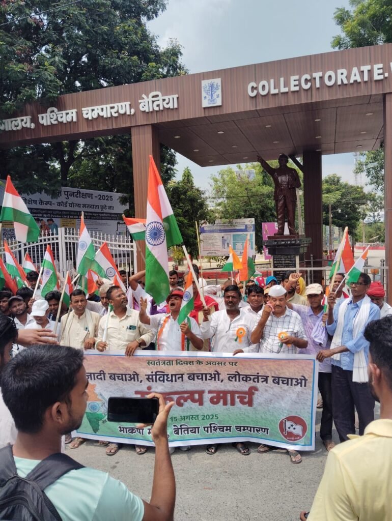 आगे कहा कि स्वतंत्रता सिर्फ एक औपचारिक जश्न नहीं, बल्कि उसे बचाने और उसके मूल्यों को ज़मीन पर लागू करने का निरंतर प्रयास है। भाकपा (माले) नेता फरहान राजा, विनोद यादव,संजय यादव, सुरेन्द्र चौधरी, रमाशंकर राम, जितेंद्र राम, अरूण तिवार, जवाहर प्रसाद आदि नेताओं ने आज के दिन को लोकतंत्र और संविधान की रक्षा के संकल्प दिवस के रूप में मनाते हुए जनता से आह्वान किया कि वे मौजूदा शासन की तानाशाही प्रवृत्तियों के खिलाफ एकजुट होकर आवाज़ बुलंद हो। इससे पहले सुबह 9.10 बजे बेतिया स्थित भाकपा माले कार्यालय पर 79 वां स्वतंत्रता दिवस मनाते हुए सुनील कुमार राव ने झंडारोहण किया, जहाँ काफी संख्या में छात्र- नौजवान, महिला पुरूष उपस्थित थे।