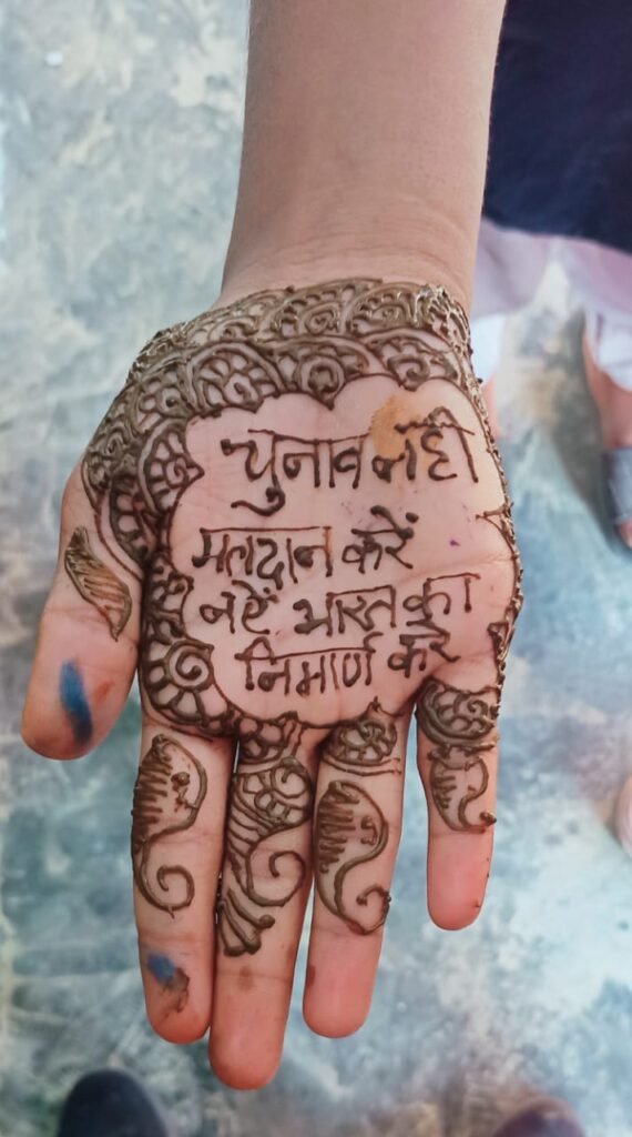 छात्र-छात्राओं ने मेहंदी कला के जरिए भी मतदान का संदेश देते हुए मताधिकार के महत्व को रेखांकित किया