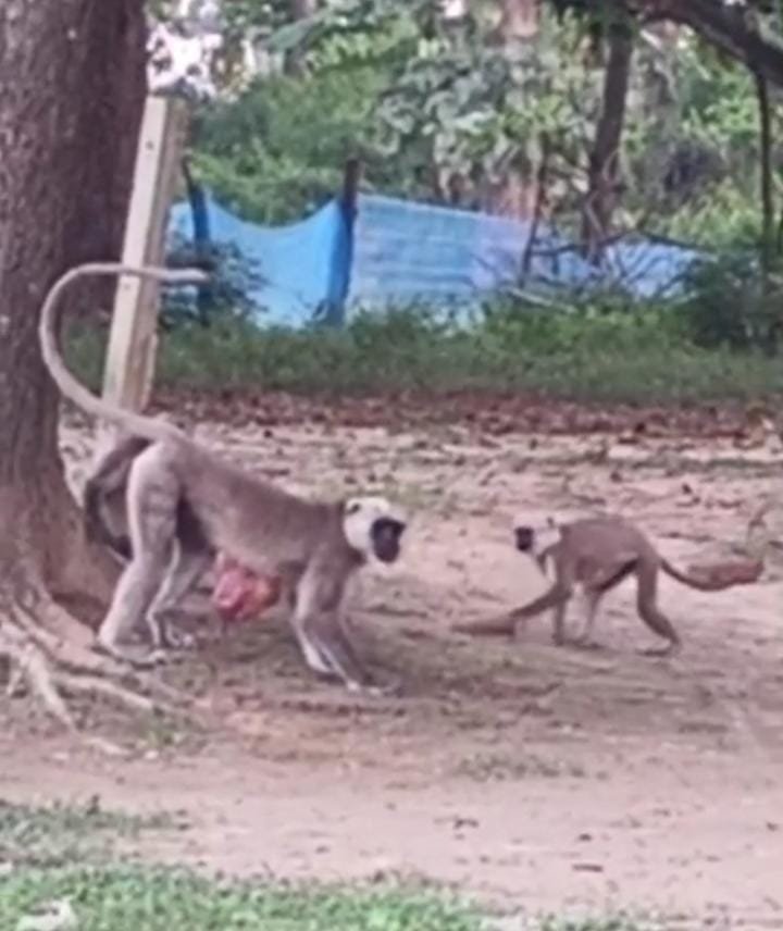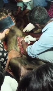 मंदिर परिसर में मौजूद बंदरों का झुंड आपस में उछल-कूद कर रहा था, इसी दौरान एक बंदर अचानक पेड़ की ऊंची डाली से नीचे गिर पड़ा। गिरने से उसके पेट में गंभीर चोट आई और पेट फट गया।