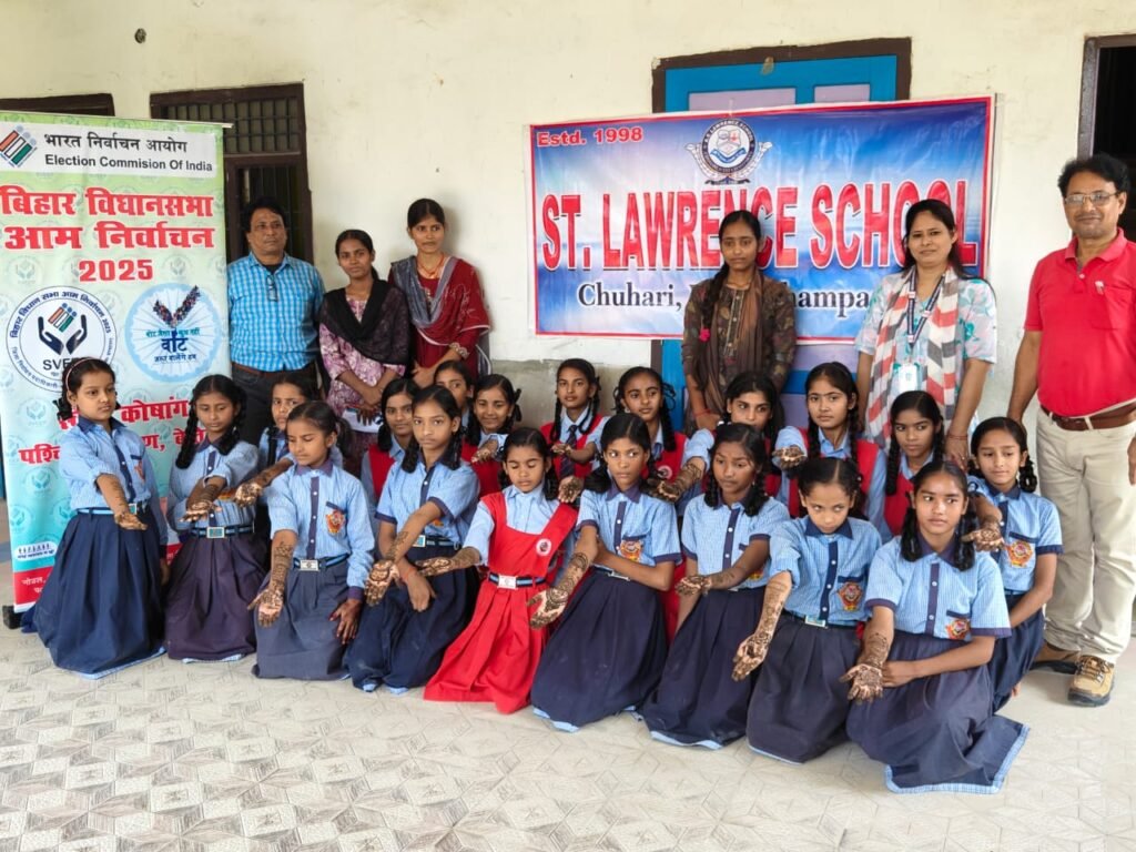 इसी क्रम में संत लौरेंस स्कूल चूहड़ी में छात्राओं के बीच मेहंदी लगाओ प्रतियोगिता का आयोजन किया गया। विद्यालय के प्रधानाध्यापक रोनाल्ड कुँअर सिंह ने कहा कि पश्चिमी चम्पारण में अधिक से अधिक मतदाता मतदान में शामिल हो इसके लिए