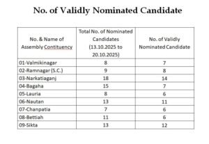 बेतिया, (ए.एल.न्यूज़)। बिहार विधानसभा आम निर्वाचन-2025 के तहत पश्चिम चम्पारण जिले के सभी 9 विधानसभा क्षेत्रों में नामांकन प्रक्रिया संपन्न हो चुकी है। 13 अक्टूबर से 20 अक्टूबर 2025 तक चले नामांकन की प्रक्रिया के उपरांत अभ्यर्थियों के नामों की जांच पूरी कर ली गई है। जिले के कुल 9 विधानसभा क्षेत्रों से 102 उम्मीदवारों ने नामांकन पत्र दाखिल किए थे, जिनमें से 77 अभ्यर्थियों के नामांकन पत्र वैध पाए गए हैं। प्रत्येक विधानसभा क्षेत्र में वैध अभ्यर्थियों की संख्या इस प्रकार है —
