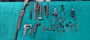 (1) एक देशी कट्टा, (2) एक एकनाली बंदूक, (3) एक अर्द्धनिर्मित पिस्टल, (4) पाँच जिंदा कारतुस, (6) एक मिसफायर कारतुस. (7) एक खोखा, (8) एक पिस्टल का मैगजीन, (9) पिस्टल का बैरेल, (10) नौ पीस पिस्टल / कट्टा का हैमर (11) चार पीस ट्रिगर. (12) चौतीस पीस पिस्टल / कट्टा का स्प्रिंग गाईड (13) एक पीस लोहा छेद करने का बरमा (14) एक पीस आग्नेयास्त्र मापने वाला गज (15) दो पीस राईफल का शेयर (16) हथियार कसने वाला यंत्र (Voice), (17) एक हथौड़ी, (18) एक रेती, (19) चार पीस हैंड ड्रिल का फल्ली (लोहा छेदने वाला), (20) एक पीस पिस्टल का बैरेल (21) दो पीस हथियार का मोटाई जाँच करने वाला यंत्र (डाया), (22) दो पीस स्लाईड लॉकिंग (23) एक पीस बैरेल का कटा हुआ भाग, (24) एक पीस बैरेल की सिधाई मापने वाला यंत्र (गेज), (25) दो पीस बैरेल क्लिनिंग रड, (26) एक पीस ड्रीड, (27) दो पीस लौंग फ्लायर, (28) एक पिन. (29) एक सेफ्टी शेयर, (30) एक स्कू ड्राईव प्लस, (31) एक पेचकस बरामद किया गया।
