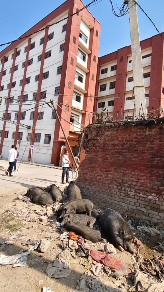 हालात यह हैं की एक तरफ बिल्डिंग के अंदर बेड पर मरीज है, तो, वही दीवाल के उस पार दूसरी तरफ सूअरों का झुंड लेटा हुआ है