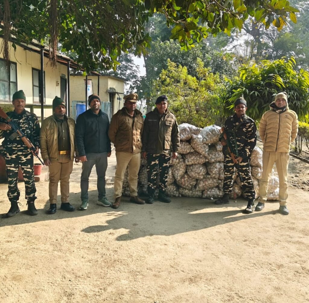 महराजगंज, (तैयब अली चिश्ती)। जनपद के थाना निचलौल क्षेत्र अंतर्गत भारत नेपाल बॉर्डर पर चाइनिज लहसुन की तस्करी की सूचना पर एसएसबी पुलिस एवं कस्टम विभाग की संयुक्त टीम ने बड़ी कार्रवाई करते हुए 39 बोरी लहसुन बरामद की है। तस्कर सीमा क्षेत्र में डंप कर रखे थे।एसएसबी समवाय झुलनीपुर ने बताया कि शुक्रवार को मुखबिर के द्वारा सूचना मिली कि कुछ तस्कर भारत नेपाल सीमा के कनमिसवा गांव के पास अवैध चाइनिज लहसुन की तस्करी का प्रयास कर रहे हैं सूचना को गंभीरता से लेते हुए तत्काल सशस्त्र सीमा बल समवाय झूलनीपुर और पुलिस चौकी बहुआर से साझा किया गया। इसके बाद त्वरित कार्रवाई के लिए संयुक्त बल का गठन कर बताए गए स्थान पर दविश दी गई। अंतर्राष्ट्रीय पिलर संख्या 499 से लगभग 200 मीटर भारत के तरफ कनमिसवा गांव के नजदीक पहुंचकर जांच किया गया तो देखने में आया कि खेतों में स्थित पेड़ों और बंबू झाड़ियों में छुपवाकर अलग अलग जगह पर पुआल से ढक कर बोरियों रखा गया 39 बोरी में चाइनिज लहसुन बरामद किया गया। एकत्रित किए हुए सामान की तलाशी ली गई जिसमें कुल 39 बोरियों में पैक चाइनीस लहसुन जिसका प्रत्येक बोरी का वजन 30 किलोग्राम और कुल वजन 1170 किलोग्राम हुआ। संयुक्त दल के द्वारा समय 9:40 बजे बरामद हुए कुल 39 बोरी को मौके पर ही जप्त कर लिया गया। इस मौके पर चौकी प्रभारी बहुआर भूपेंद्र प्रताप सिंह, कांस्टेबल अंकित कुमार, कांस्टेबल आनंद यादव, कांस्टेबल प्रखर कुशवाहा, कस्टम निचलौल निरीक्षक सौरभ मिश्रा, हेड कांस्टेबल सुधाकर, एसएसबी निरीक्षक सुभाष चंद्रा, आरक्षी विनोद कुमार कुशवाहा, आरक्षी देवचरण नर्जरी, आरक्षी आनंद प्रकाश शर्मा, आरक्षी बंकर अमोल गोविंदा रहे।
