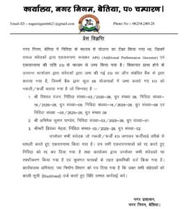 मिली जानकारी के अनुसार नगर निगम बेतिया में फर्जी बैंक एफडी लगाकर ठेकेदारों के द्वारा करोड़ों का कार्य किया गया है। सूत्रों के अनुसार इन संवेदकों को कुछ राजनीतिज्ञों का संरक्षण प्राप्त है। अब देखना यह है कि इस मामले में कहां तक न्यायोचित कार्रवाई हो पाती है।