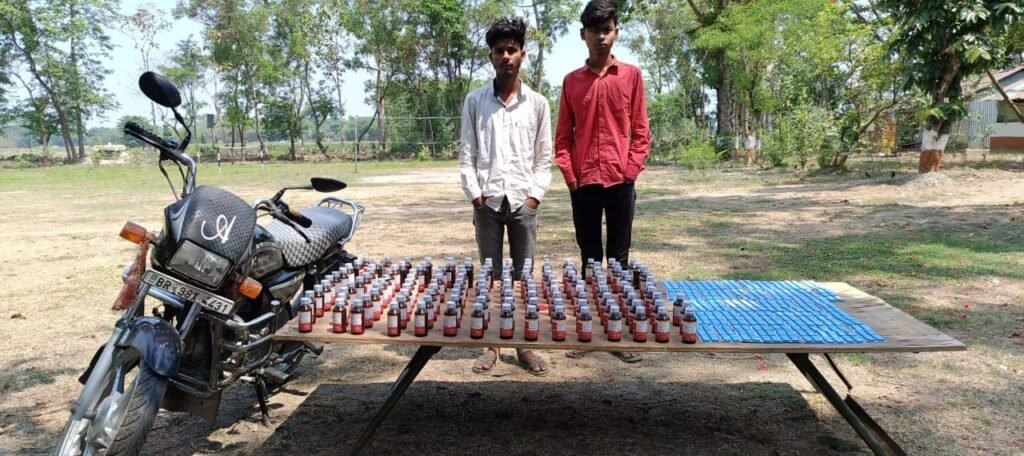 वीरपुर (सुपौल)। एसएसबी 45वीं बटालियन की सीमा चौकी फ़तेहपुर के नाका दल ने ड्यूटि के दौरान भारत- नेपाल अंतरराष्ट्रीय बार्डर पर प्रतिबंधित औषधियों और मोटरसाईकिल के साथ 02 तस्करों को धर दबोचा है। उक्त आशय की जानकारी देते हुए 45वीं बटालियन के डिप्टी कमान्डेंट रूपेश शर्मा ने बताया कि विश्वसनीय सूत्रों के माध्यम से सूचना मिली थी कि एसएसबी सीमा चौकी फ़तेहपुर के सीमा स्तम्भ संख्या 204/1 के क्षेत्र से भारत से नेपाल की तरफ प्रतिबंधित औषधियों की तस्करी होने वाली हैं। सूचना की पुष्टि करने के उपरांत एक विशेष नाका दल का गठन किया गया। सहायक उप-निरीक्षक करम सिंह के नेतृत्व में मुख्य आरक्षी बिरेन्द्र सिंह एवं अन्य 02 का नाका दल चिन्हित स्थान के लिए रवाना हुआ एवं सतर्कता के साथ ड्यूटि करने लगे। कुछ समय उपरांत नाका दल ने देखा कि दो व्यक्ति एक मोटरसाइकल से भारत से नेपाल की तरफ जा रहे थे। पूर्व प्राप्त सूचना के आधार पर नाका दल द्वारा उन्हें रोककर पूछताछ की गयी एवं तलाशी ली गयी तलाशी के क्रम में मोटर साइकल की डिक्की एवं उक्त व्यक्तियों के पास के बैग से प्रतिबंधित औषधियाँ डेलेक्स डीसी कफ सिरफ 143 बोतल तथा स्पासमो प्रॉक्सीवन-1128 कैप्सुल प्राप्त हुए। जिन्हें नाका दल द्वारा बरामद किया गया। हिरासत में लिए गए व्यक्तियों की पहचान आनंद कुमार, उम्र-19 वर्ष, पिता-रामदेव मेहता, तथा सूजल कुमार गुप्ता, उम्र-16 वर्ष, पिता- प्रकाश कुमार गुप्ता, दोनों ग्राम- डूमरबना, थाना- बासमतिया, अररिया, बिहार के रूप में की गयी । जब्त की गई प्रतिबंधित औषधियों एवं हिरासत में लिए गए व्यक्तियों को उत्पाद विभाग, सुपौल, बिहार के सुपुर्द किया गया।
