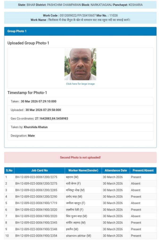 वर्क नाम : त्रिलोकवा में शेख जैनुल के खेत से शमशान घाट तक रहूवा नदी का सफाई कार्य l जिसका मस्टर रोल 11028 है। इन दोनों पंचायत में बिगत कई दिनों से फर्जी तरीकों से हाजिरी बनाई जा रही है। वही सूत्रों के हवाले से जानकारी के अनुसार पिछले कई दिनों से यहाँ 15 से 25 लोगो को बुलाकर फोटो खींचकर डाली जा रही है डाली गई फोटो मे देख सकते है। एक मजदूर का फोटो और हाजरी पांच मजदूर का बनाया गया है। इससे यह स्पस्ट हो रहा है की सिर्फ कागजों पर कार्यों को किया जा रहा है। इस मामले की खुलासा तो तब हुई जब हमारी टीम धरातल पर पहुँच कर स्थानीय लोगों और ग्रामीणों से जानकारी प्राप्त की। सवाल यह उठता है कि महात्मा गांधी राष्ट्रीय ग्रामीण रोजगार गारंटी योजना (मनरेगा) के तहत चल रहे कार्यों में बड़े पैमाने पर फर्जीवाड़ा सामने आया है। फर्जी हाजिरी, मजदूरों की गैरमौजूदगी, और सरकारी धन के गबन के मामले उजागर हुए हैं। इस भ्रष्टाचार से न केवल सरकारी धन की लूट हो रही है, बल्कि गरीब मजदूरों के अधिकारों का भी हनन किया जा रहा है। स्थानीय प्रशासन, पंचायत प्रतिनिधि, रोजगार सेवक और PO की मिली भगत के बिना इतना बड़ा घोटाला संभव नहीं हो सकता।