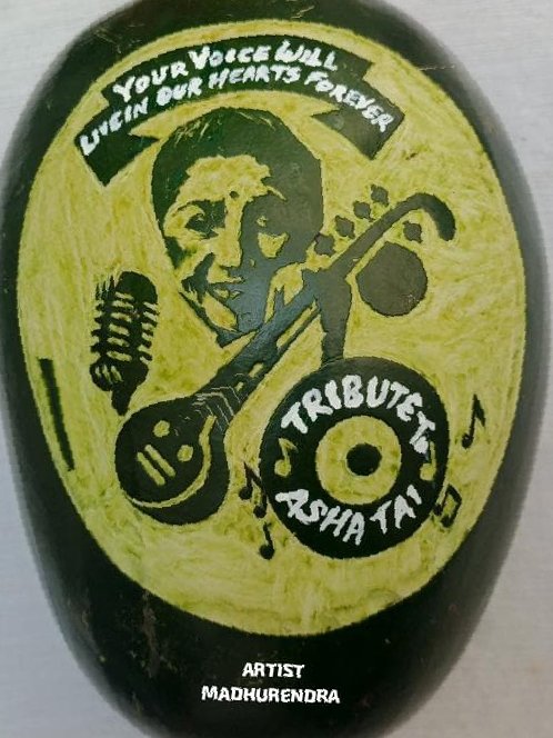 इस कलाकृति में आशा ताई को संगीत के प्रतीकों—माइक्रोफोन, सितार और सुरों के साथ दर्शाया गया है, जो उनके जीवन और संगीत यात्रा को दर्शाता है।